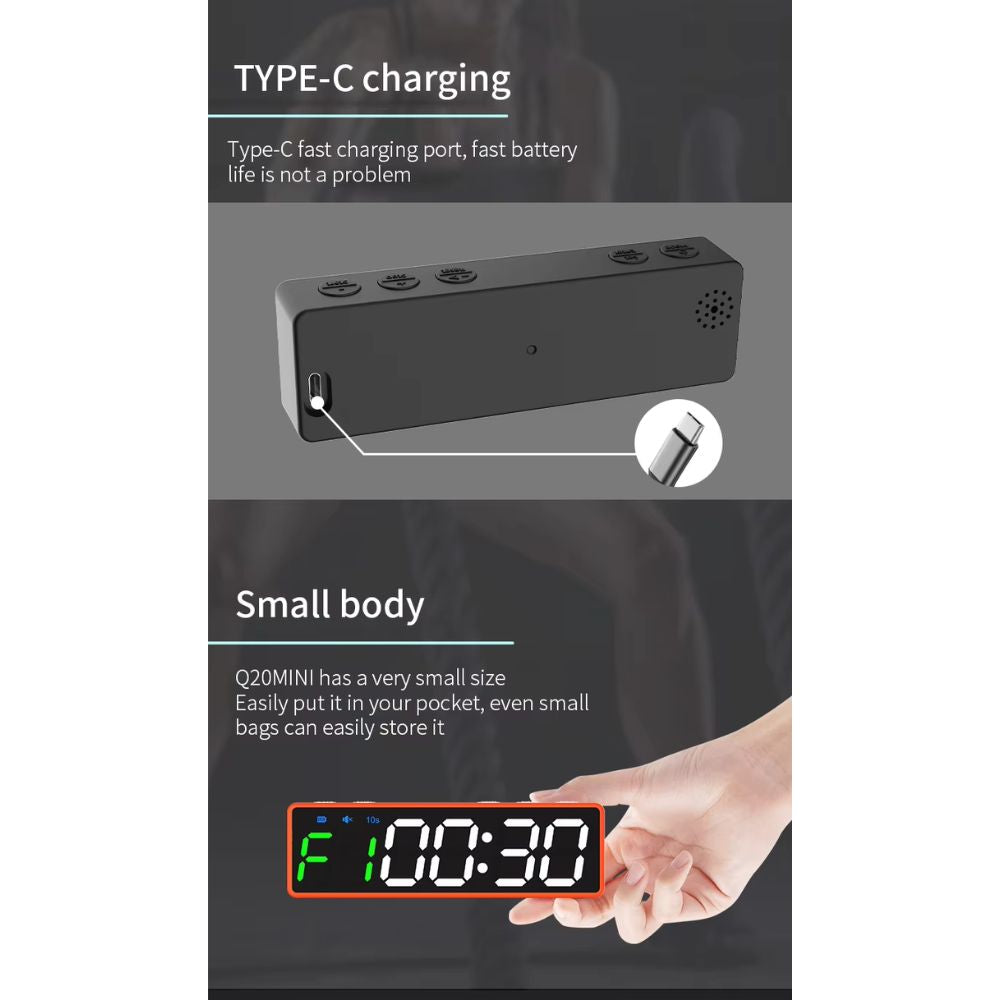 Q10 Mini är enkel att ställa in via de tre ovansidans knappar. Du växlar snabbt mellan nedräkning, uppräkning och förinstallerade intervallprogram. Med magnet på baksidan sitter den stadigt på vilken metall som helst – perfekt både i boxen och på hemmagymmet.